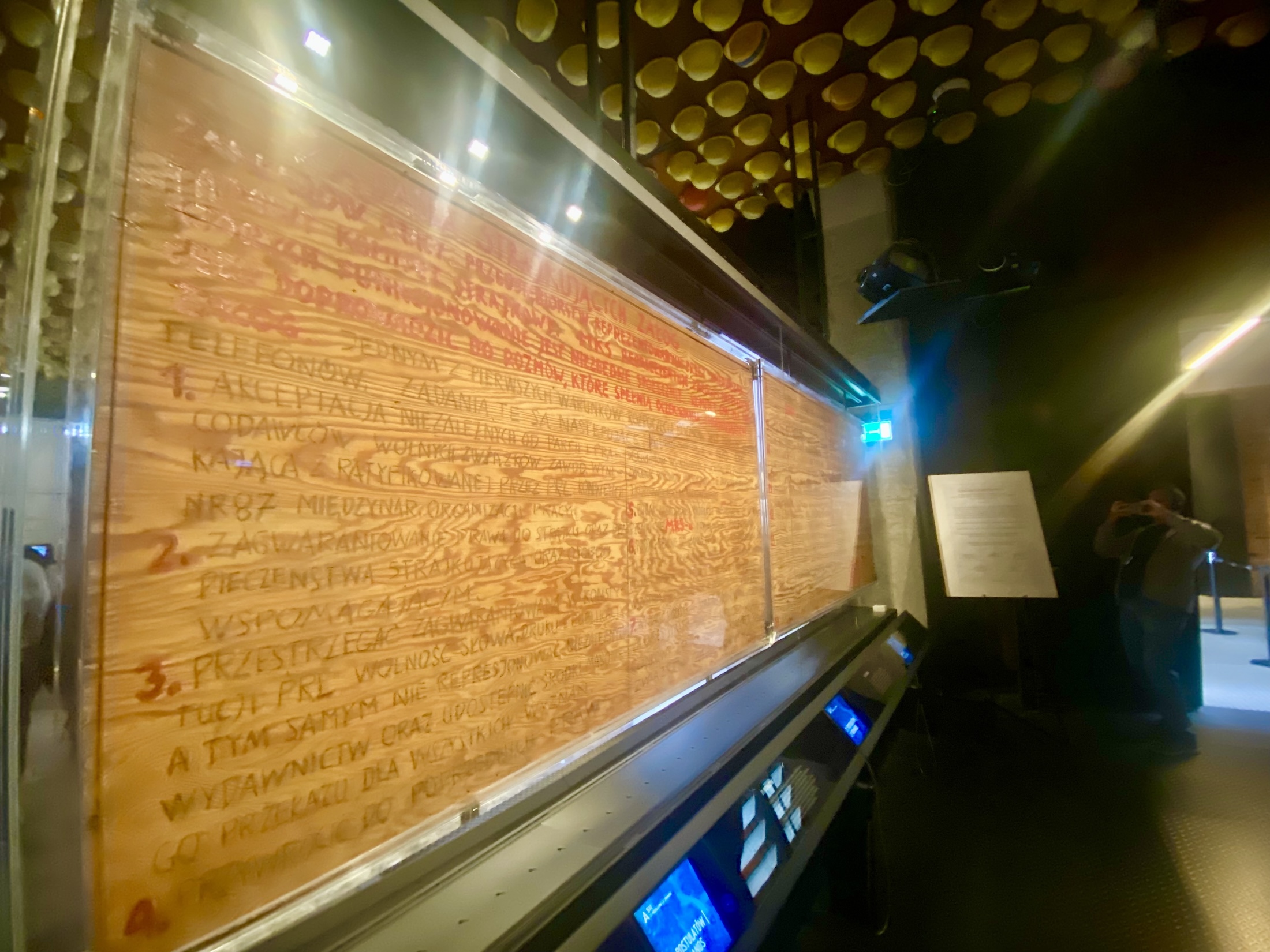 Heute ein Immaterielles UNESCO Weltkulturerbe: das Original der 21 Forderungen der Werftarbeiter:innen von Gdansk an die kommunistische Regierung im Europäischen Zentrum für Solidarität in Gdansk. Diese Forderungen waren die Initialzündungen für die Auflehnung gegen die Unterdrückung und letztendlich für den Zusammenbruch der kommunistischen Ordnung in Mittel- & Osteuropa. ©Trail Angels.