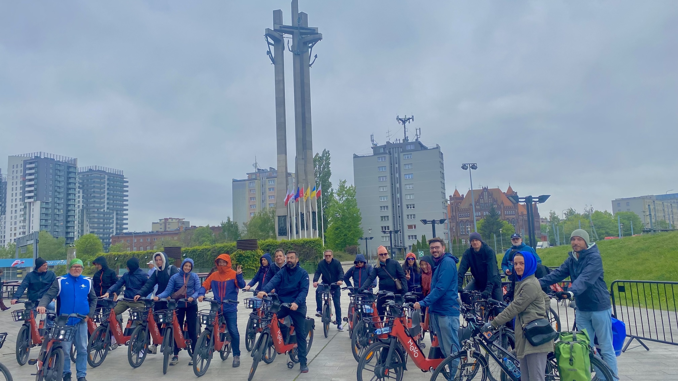 Unsere wetterfeste internationale Projektgruppe am Iron Curtain Trail – Eurovelo 13 mitten in Gdansk. Im Hintergrund ein besonders monumentales Mahnmal der Freiheitsliebe: das Denkmal für die gefallenen Werftarbeiter vom niedergesachlagenen Streik im Jahr 1970. ©Trail Angels